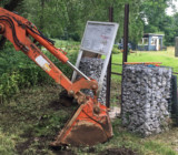 Um diesen Abschnitt künftig besser pflegen zu können, haben wir damit begonnen, einen Teil der Böschung in Richtung Radtrasse abzutragen und mit einer Trockenmauer aus als Pflastersteinen abzufangen. So entsteht ein knapp ein Meter breiter Streifen neben dem Gleis, der begrünt und später einfacher mit dem Mäher gepflegt werden kann. Die Trockenmauer bietet zahlreichen Kleintieren und Insekten ein Zuhause.